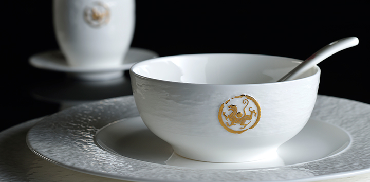 中國(guó)古代傳說(shuō)中,四神獸為天之四靈,掌管天地四方,故王者宮殿喜用四獸為瓦,取平定四方之意。《淮南子》云:“西方金也,其獸為白虎。”神獸白虎掌管西方,是正氣之神,有辟邪懲惡、招財(cái)納喜之意,多受達(dá)官貴人喜愛(ài)。本套作品創(chuàng)意來(lái)自漢代未央宮遺址出土的白虎紋瓦當(dāng),取其高貴威嚴(yán)之勢(shì)、古樸深遠(yuǎn)之韻,虎躍玉間,平凡的餐具一躍成為尊貴高雅的象征,是彰顯大氣、耀顯尊榮的選擇。
